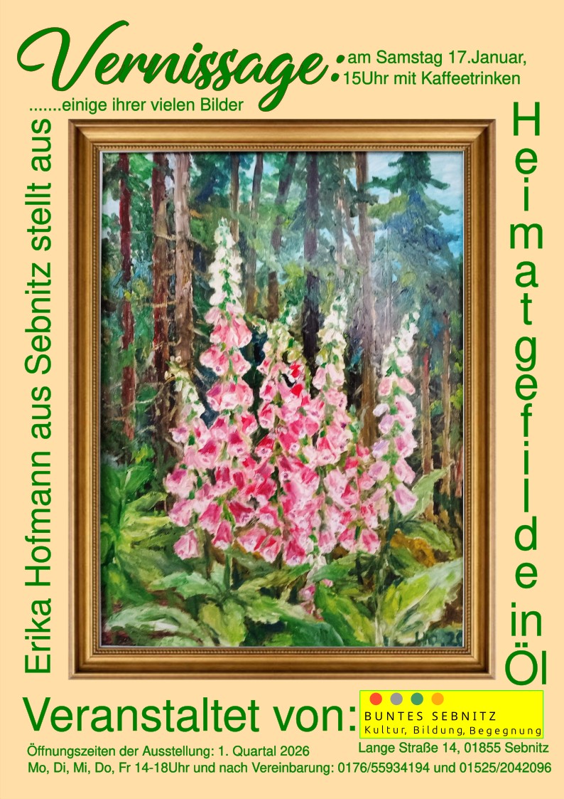 Ort: Buntes Sebnitz, Lange Straße 14, 01855 Sebnitz Vernissagetermin: Samstag 17.1.15.00Uhr Öffnungszeiten der Ausstellung: Mo, Di, Mi, Do, Fr 14-18.00Uhr bis Ende März Schon wieder findet eine sehenswerte Ausstellung in … Weiterlesen