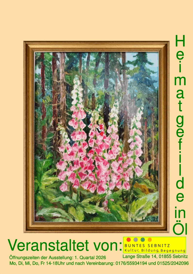 Ort: Buntes Sebnitz, Lange Straße 14, 01855 Sebnitz Vernissagetermin: Samstag 17.1.15.00Uhr Öffnungszeiten der Ausstellung: Mo, Di, Mi, Do, Fr 14-18.00Uhr bis Ende März Schon wieder findet eine sehenswerte Ausstellung in … Weiterlesen